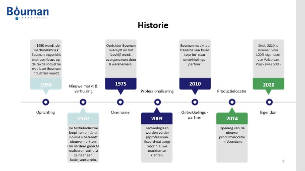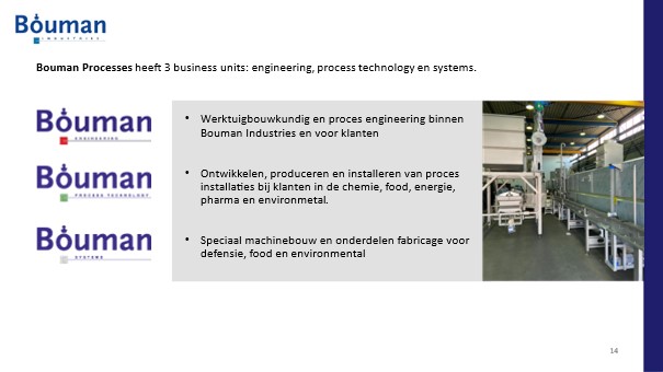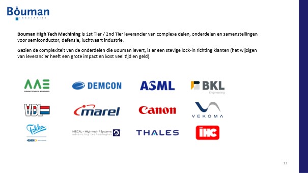 Bouman is een hoogwaardig productiebedrijf in de metaalindustrie met een mooie basis van gerenommeerde klanten met wie ze al jarenlang samenwerken. DGA Wilco van Wijck heeft ruim 5 jaar geleden zijn hernieuwde strategie ingezet (langdurige samenwerking met mooie klanten door het leveren van een hoge toegevoegde waarde en daaraan gekoppeld hoge marges) waarvan Bouman steeds meer de vruchten begint te plukken. De corona periode heeft tijdelijk roet in het eten gegooid waardoor het uitrollen van de strategie vertraging heeft opgelopen.