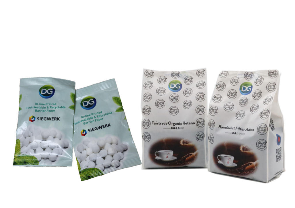 DG press heeft onlangs twee verpakkingen geproduceerd in samenwerking met industriepartners. Dit onderstreept dat DG press blijft innoveren met duurzame initiatieven die op onze machines kunnen worden gedrukt. Het Non-PE pepermuntzakje won in oktober 2024 de Sustainability Award in Duitsland in de categorie Circular Economy, en de Mono-PE koffiezak was een top 10-finalist bij de NVC Gouden Noot Award 2024, Nederland.
