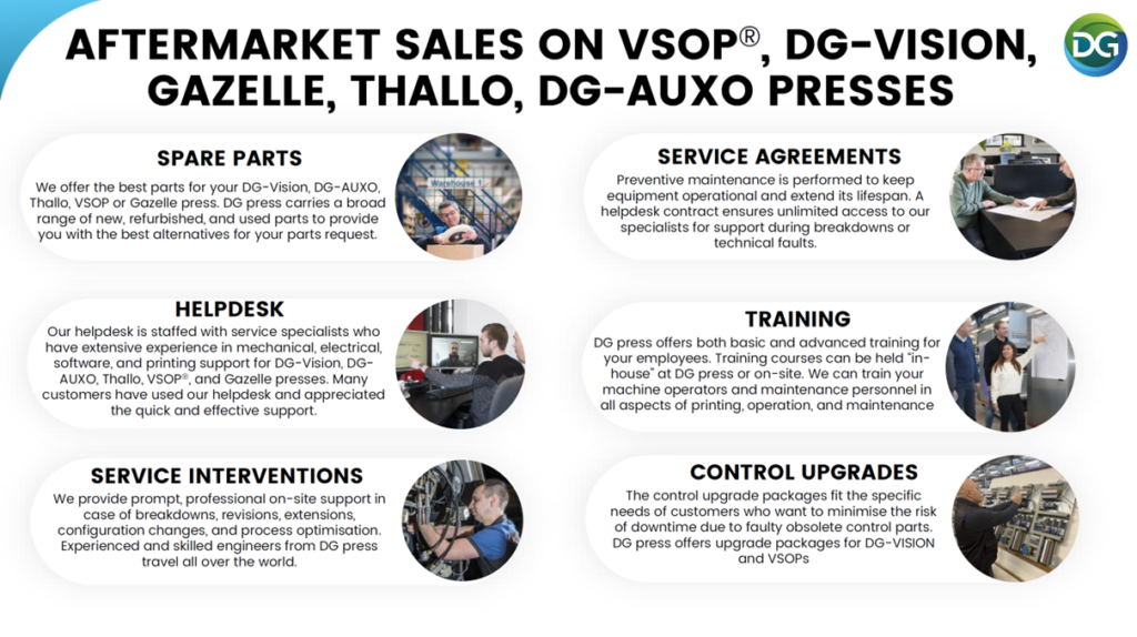 Wij verlenen service voor de drukkerijen die met de machines werken van Drent Goebel (DG-Vision, VSOP en Gazelle) en op onze eigen DG press machines de Thallo en DG-AUXO. In de beginjaren lag de nadruk daarom veelal op het uitvoeren van onderhoud op de bestaande machines en het verkopen van reserveonderdelen.