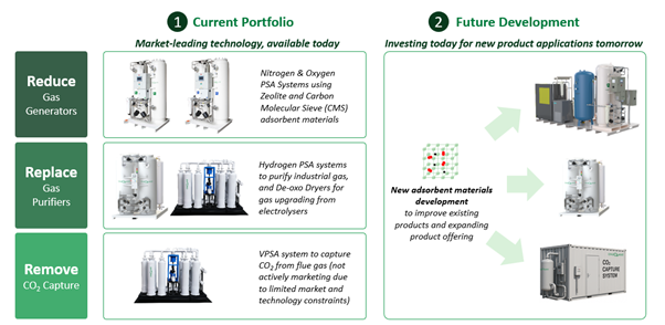 Voor het Reduce segment gaat het om een portfolio van luchtscheiders, die op locatie bij een industriële gebruiker zowel zuiver stikstof als zuiver zuurstof kunnen produceren. Dit bespaart emissies uit de transportketen van industriële gassen. Hiermee bereiken we nu al een emissiereductie van 39% ten opzichte van “best industrial practice”