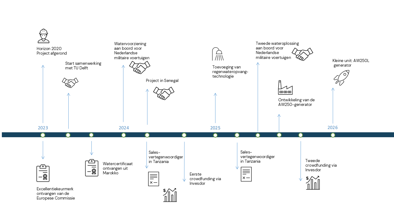 In de loop der jaren hebben we onze organisatie en de door ons geboden oplossingen voor lokale watervoorziening succesvol ontwikkeld en geïmplementeerd. Zodoende hebben we ervaring en staat van dienst opgebouwd in de uitvoering van diverse commerciële en humanitaire projecten. Elke mijlpaal vertegenwoordigt niet alleen een verdere ontwikkeling van onze organisatie, maar ook technologische vooruitgang en groei.